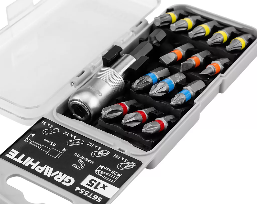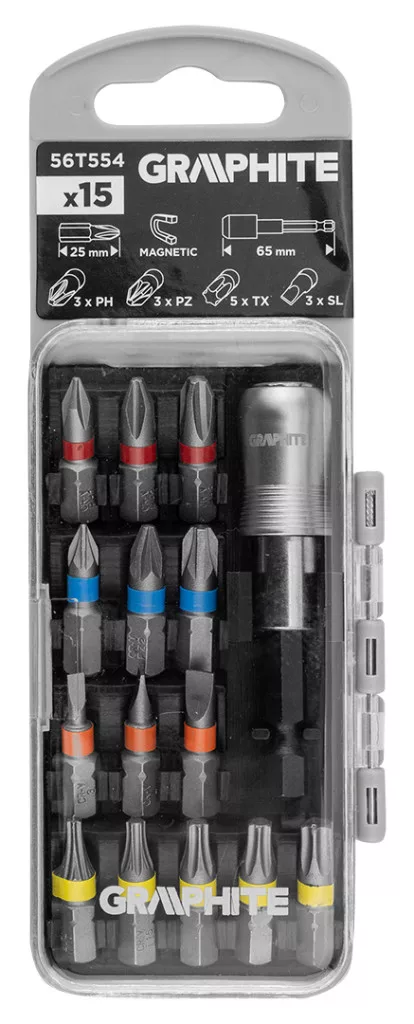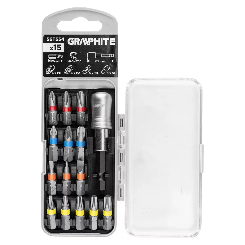 Graphite csavarhúzó bitkészlet 25mm, mágneses szárral, műanyag tokban (15db/készlet)