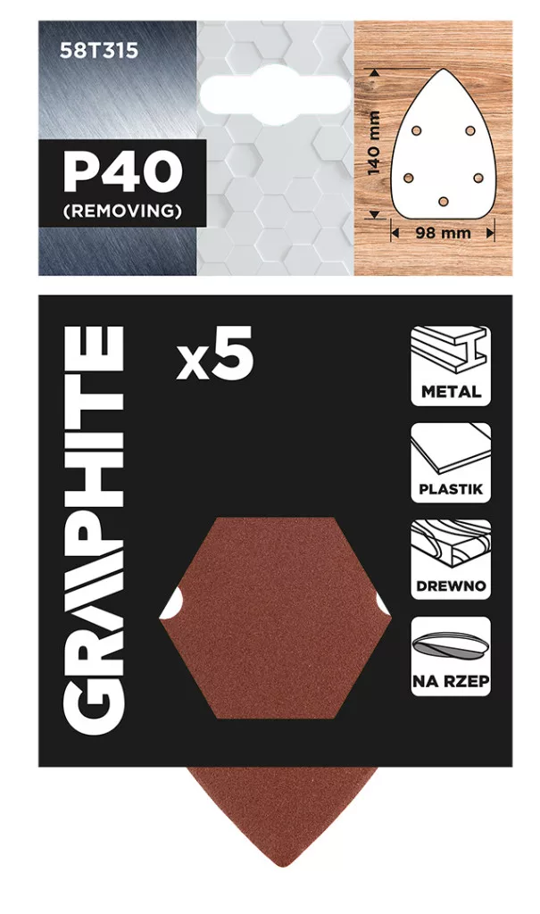 Graphite csiszolópapír tépőzáras deltacsiszolóhoz 98x140mm, P40, 5 lyukas (5db/csomag)