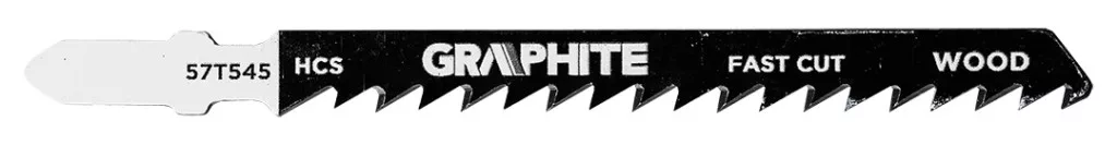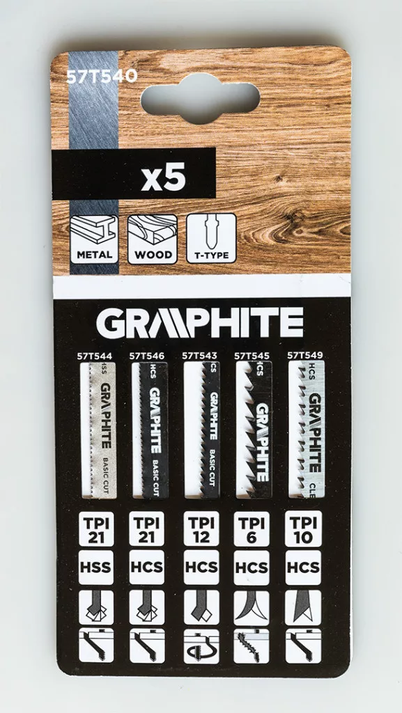 Dekopírfűrészlap készlet, 6 TPI, 10 TPI, 12 TPI, 20 TPI, HCS, T-befogású, 5 db. 57T540 Graphite által gyártott készlet, amely a következőket tartalmazza: 1x 57T543 szúrófűrészlap, 12 TPI fogsűrűséggel, HCS anyaggal és T típusú fogantyúval. Jellemzője a 76 mm teljes hossz, 50 mm munkahossz, 5,2 mm szélesség, 1 mm vastagság és 2 mm fogosztás. Alkalmazások: puhafa (2-15 mm), rétegelt lemez, forgácslap, ácsolt rétegelt lemez, farostlemez, íves vágásokhoz, alapvágáshoz. A Graphite készlet tartalmaz továbbá 1x 57T544 szúrófűrészlapot, 21 TPI fogsűrűséggel, HCS anyagból és T alakú fogantyúval. A készlet 2 darabját 76 mm teljes hossz, 50 mm munkahossz, 8 mm szélesség, 1 mm vastagság és 1,2 mm fogköz jellemzi. Alkalmazás: vékony fémlemezek (1-3 mm), alapvágás. A készlet 1x 57T545 szúrófűrészlapot is tartalmaz, 6 TPI fogsűrűséggel, HCS anyagból és T alakú fogantyúval. Szerszám teljes hossza 100 mm, munkahossza 74 mm, szélessége 8 mm, vastagsága 1,2 mm és fogosztása 4 mm. Alkalmazás: puhafa (5-50 mm), forgácslap, rétegelt lemez, farostlemez, gyors vágás, durva vágás. A készlet tartalmaz továbbá 1x 57T546 szúrófűrészlapot, fogsűrűség 21 TPI, HCS anyag és T alakú fogantyú. Teljes hossz 76 mm, munkahossz 50 mm, szélesség 8 mm, vastagság 1 mm és fogosztás 1,2 mm. Alkalmazások: puhafa (1,5-15 mm), rétegelt lemez, forgácslap, ácsolt rétegelt lemez, farostlemez, alapvágás. A Graphite márkakészlet 1x 57T549 szúrófűrészlapot is kínál, 10 TPI fogsűrűséggel, HCS anyaggal és T alakú fogantyúval. Teljes hossza 100 mm, munkahossza 74 mm, szélessége 8 mm, vastagsága 1,5 mm, fogazati távolsága 2,5 mm. Alkalmazások: puhafa, forgácslap, asztalos rétegelt lemez, farostlemez (3-30 mm), műanyag/epoxi (átmérő <30 mm), tiszta vágás.