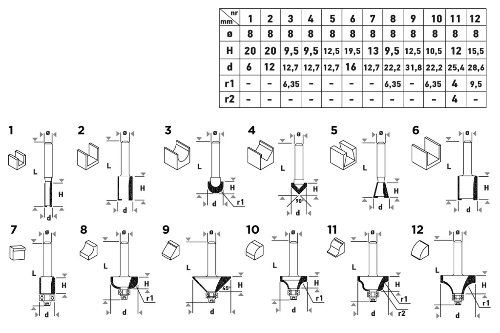Graphite felsőmaró kés készlet 8mm-es szárral (12db/csomag)