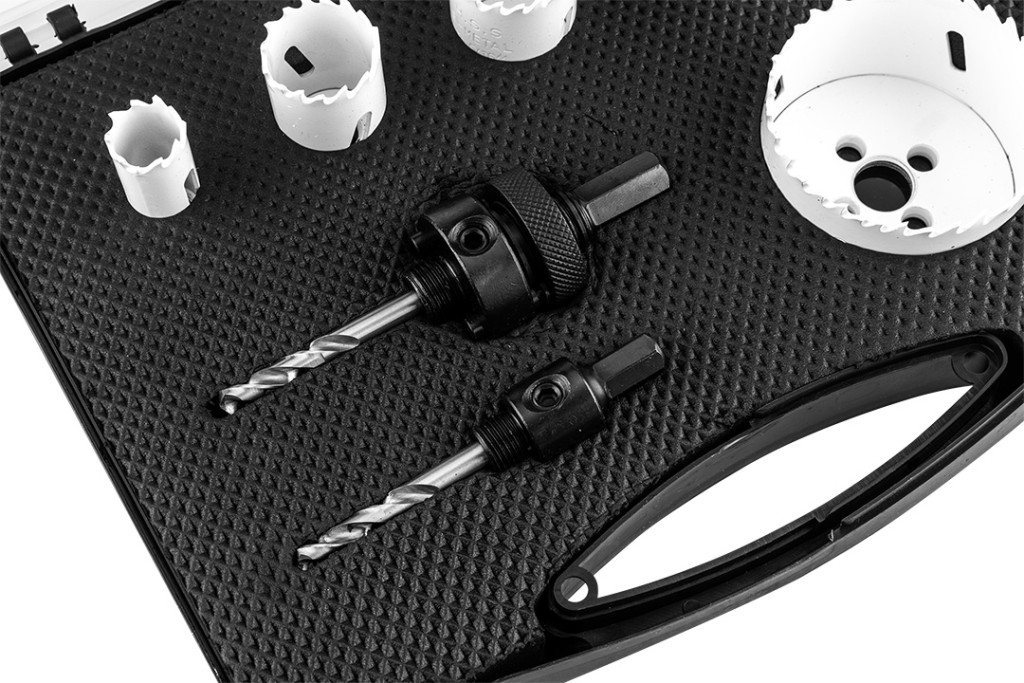 Graphite bimetál lyukfűrészek 19-68 mm, 7 darabos készlet 56T723 a Graphite-tól 51 mm magassággal (19, 29, 33 mm átmérő esetén) és 44 mm magassággal (51, 68 mm átmérő esetén) 38 mm mélységig történő fúrást tesznek lehetővé. HSS-ből készülnek és 1/2''' x 20 UNF (19, 29 mm), 5/8" x 18 UNF (33, 51, 68 mm) menettel vannak ellátva. Fém, rozsdamentes acél (Inox), öntöttvas, sárgaréz, alumínium és fa megmunkálására tervezték. A Graphite lyukfűrészeket a készletben kínált adapterekkel - 3/8 Hex és 7/16 Hex - ajánlott használni. A szerszámok maximális fordulatszámai az anyagtól függően változnak: acél - 460 fordulat/perc (19 mm átmérő esetén), 300 fordulat/perc (29 mm átmérő esetén), 260 fordulat/perc (33 mm átmérő esetén), 170 fordulat/perc (51 mm átmérő esetén), 130 fordulat/perc (68 mm átmérő esetén); Inox acél - 230 fordulat/perc (19 mm átmérő esetén), 300 fordulat/perc (29 mm átmérő esetén), 260 fordulat/perc (33 mm átmérő esetén), 170 fordulat/perc (51 mm átmérő esetén), 130 fordulat/perc (68 mm átmérő esetén); Inox acél - 230 fordulat/perc (19 mm átmérő esetén)./rpm (for 19 mm diameter), 150 rpm (for 29 mm diameter), 135 rpm (for 33 mm diameter), 85 rpm (for 51 mm diameter), 65 rpm (for 68 mm diameter); aluminium - 690 rpm (for 19 mm diameter), 450 rpm (for 29 mm diameter), 390 rpm (for 33 mm diameter), 255 rpm (for 51 mm diameter), 130 rpm (for 68 mm diameter); stainless steel - 150 rpm (for 33 mm diameter), 150 rpm (for 51 mm diameter), 130 rpm (for 51 mm diameter); stainless steel - 230 rpm (for 19 mm diameter), 150 rpm (for 29 mm diameter), 135 rpm (for 33 mm diameter), 85 rpm (for 51 mm diameter), 65 rpm (for 68 mm diameter); aluminium - 690 rpm (for 19 mm diameter), 450 rpm (for 33 mm diameter), 255 rpm (for 51 mm diameter)/rpm (for diameter 51 mm), 190 rpm (for diameter 68 mm); wood - 680 rpm (for diameter 19 mm), 450 rpm (for diameter 29 mm), 390 rpm (for diameter 33 mm), 200 rpm (for diameter 51 mm), 165 rpm (for diameter 68 mm); cast iron - 300 rpm (for diameter 19 mm), 200 rpm (for diameter 29 mm), 200 rpm (for diameter 33 mm), 200 rpm (for diameter 33 mm), 165 rpm (for diameter 33 mm); aluminium - 690 rpm (for diameter 19 mm), 450 rpm (for diameter 29 mm), 390 rpm (for diameter 33 mm), 200 rpm (for diameter 51 mm), 165 rpm (for diameter 68 mm); cast iron - 300 rpm (for diameter 29 mm), 200 rpm (for diameter 33 mm), 190 rpm (for diameter 33 mm), 190 rpm (for diameter 68 mm)/(29 mm átmérő esetén), 175 rpm (33 mm átmérő esetén), 115 rpm (51 mm átmérő esetén), 85 rpm (68 mm átmérő esetén); sárgaréz - 600 rpm (19 mm átmérő esetén), 400 rpm (29 mm átmérő esetén), 345 rpm (33 mm átmérő esetén), 230 rpm (51 mm átmérő esetén), 165 rpm (68 mm átmérő esetén). A bimetál lyukfűrészeket fúrógép vagy csavarozógép segítségével történő használatra tervezték.