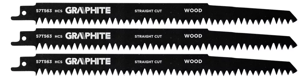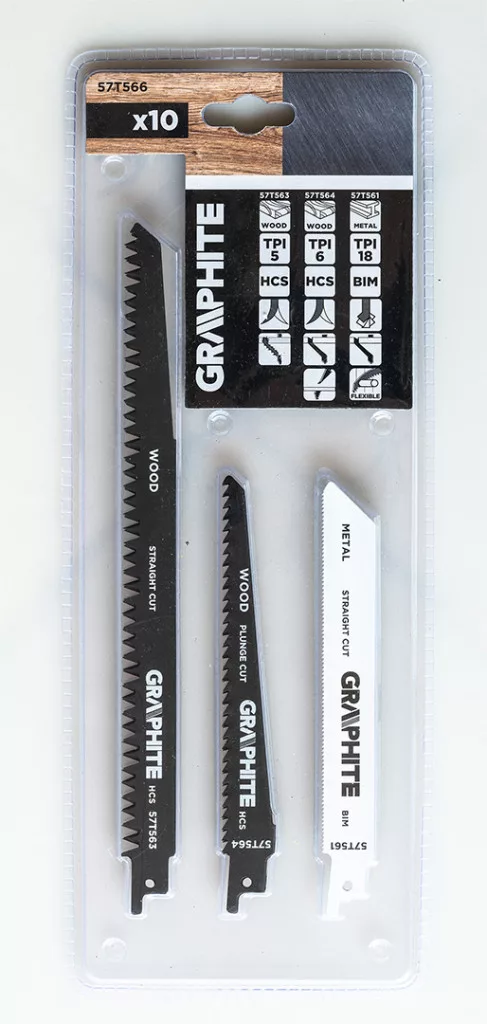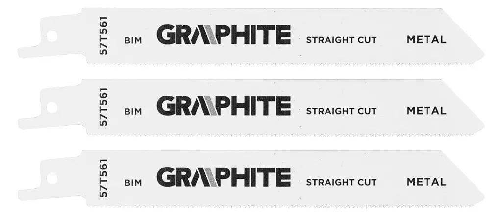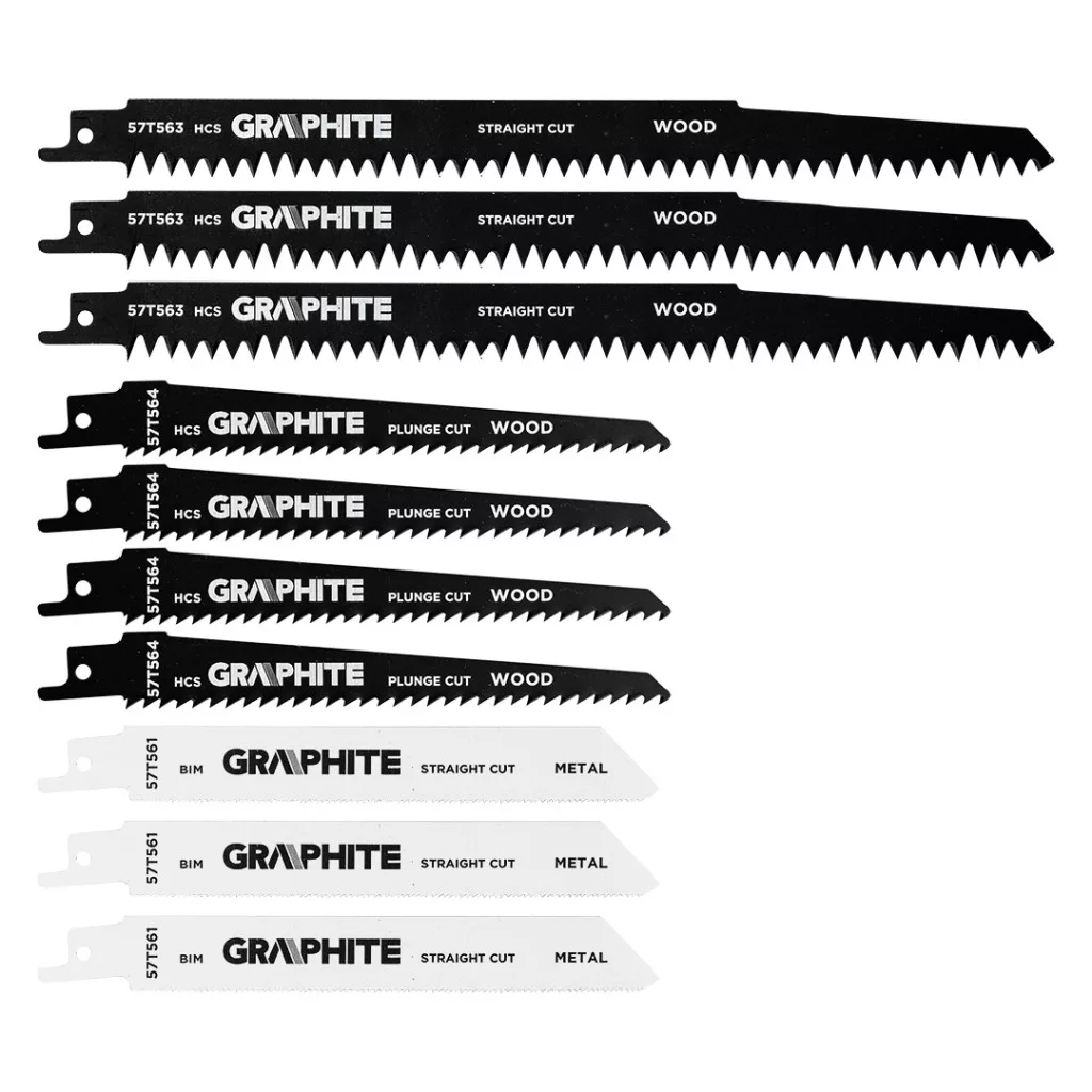 Szablyafűrészlap készlet, TPI 5, TPI 6, TPI 18, HCS/BIM, 10 darabos készlet 57T566 a Graphite-tól, amely 10 darabot tartalmaz és a következőkből áll: 3x 57T563 - Graphite HCS fűrészlapok, 240 mm hosszú, 19 mm széles és 1,5 mm vastag, 5 mm fogközzel (5 TPI), vastag fa szög nélküli vágásához (15-190 mm), zöld fa (átmérő <190 mm) és tűzifa (átmérő 15-190 mm) vágásához; gyors és durva vágáshoz 4x 57T564 - Graphite HCS fűrészlapok, 152 mm hosszú, 19 mm széles és 1,3 mm vastag, 4 mm-es fogközzel (6 TPI), szerkezeti faanyag, rétegelt lemez, műanyag (6-100 mm), fa lapok (<75 mm), forgácslap és MDF (6-60 mm) vágásához; tiszta íves és merülő vágásokhoz 3x 57T561 - Graphite BIM fűrészlapok, 152 mm hosszú, 19 mm széles és 0,9 mm vastag, 1,4 mm fogosztással (18 TPI), vékony fémlemezekhez (1,5-4 mm), nyitott és zárt csövekhez és 5-100 mm átmérőjű profilokhoz; rugalmasságot és egyenes vágást biztosít.