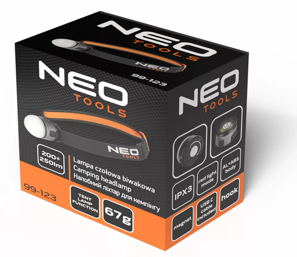Neo fejlámpa levehető pánttal, mágnes és sapkarögzítő lehetőség, fehér és vörös LED, USB töltőkábel, 250+200lum