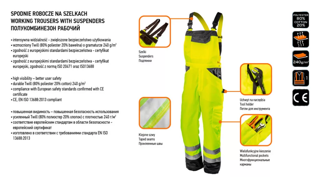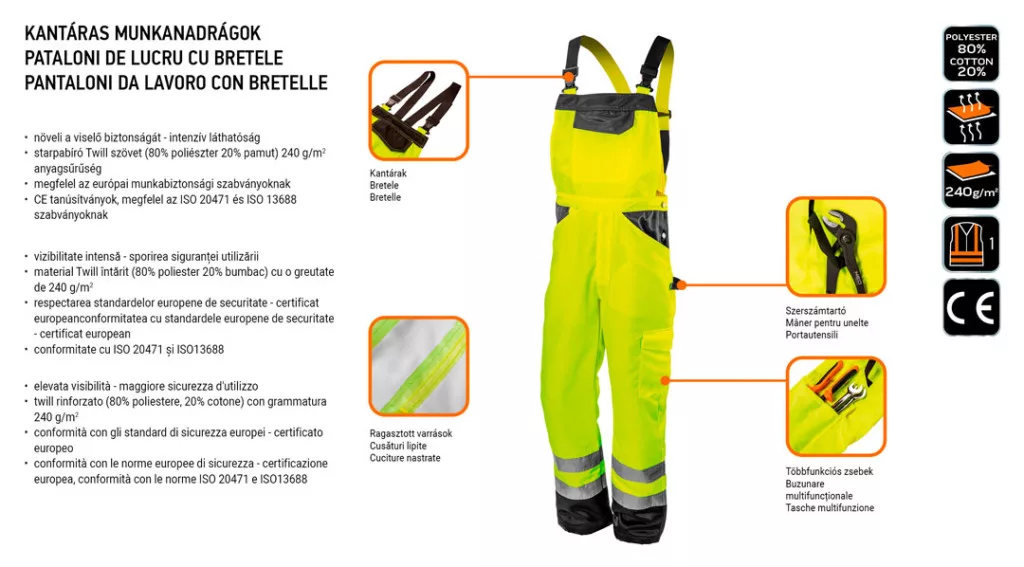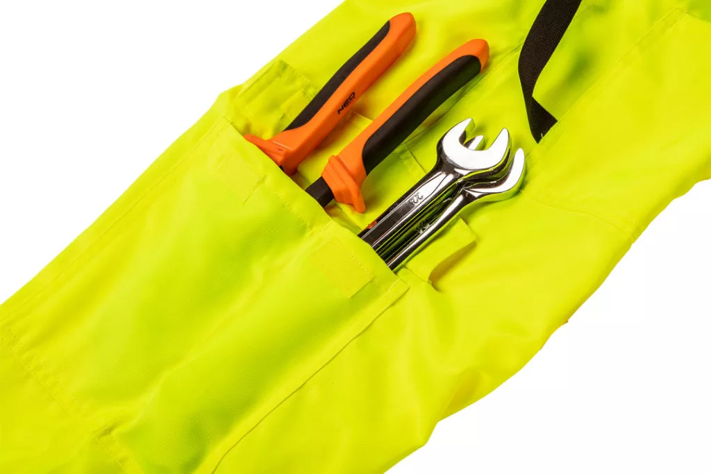 Neo láthatósági kantáros munkásnadrág, lélegző, 240gsm, Polyester+pamut, sárga, S