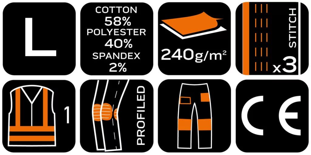Neo láthatósági munkásnadrág Mix&Match, 1. oszt., 240g/m2, külső zsebek, profilozott térdbetét, fek.-sárga, L