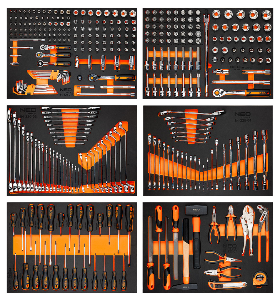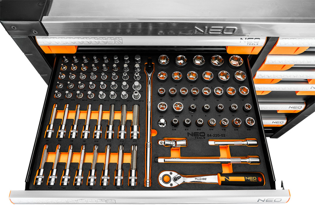 Neo 84-225-6 Műhelykocsi PRO, 12 fiókos, 358 szerszámmal, szerszámkocsi. A Neo Tools PRO 12 fiókos műhelykocsija 358 szerszámmal, amelynek maximális terhelhetősége 600 kg. A Neo Tools márka 358 szerszámmal kínálja ezt a szerszámoskocsit amelynek 6 sorban, soronként 2db fiókja van. Minden sorban egy széles és egy keskeny fiókkal. Az EVA habszivaccsal bélelt fiókok közül 6db teljesen felszerelt, többek között: ¼" és 3/8" hatszögletű dugókulcsok, TORX dugókulcsok, ötszögletű, Imbusz és TORX bitek, illesztők, adapterek, hosszabbítók, racsnis szárak, kulcsok, gyertyakulcsok, dugókulcsok, csavarhúzók, reszelők, kalapácsok vagy fogók.
