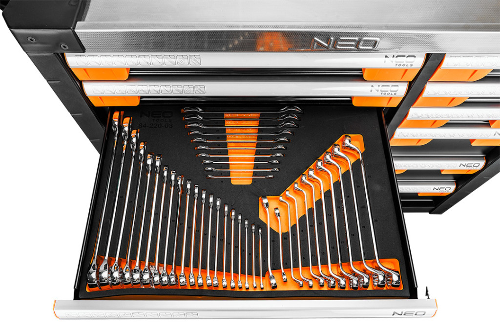 A Neo Tools szerszámos kocsi méretei 1105 x 465 x 97 mm, magassága kerekek nélkül 825 mm. Zárható fiókokkal, oldalsó perforációval rendelkezik a Neo Tools kampók számára, alumínium teteje helyet biztosít a csavarhúzóknak és tartozékoknak, valamint tájékoztató matricákkal a fiókok frontjain. A fiókok zárszerkezettel vannak ellátva, és 100%-os nyitási hosszt tesznek lehetővé. A szekrény robusztus SPCC acélszerkezetű. A PRO Moto Expert sorozat a legigényesebb felhasználóknak is megfelel.