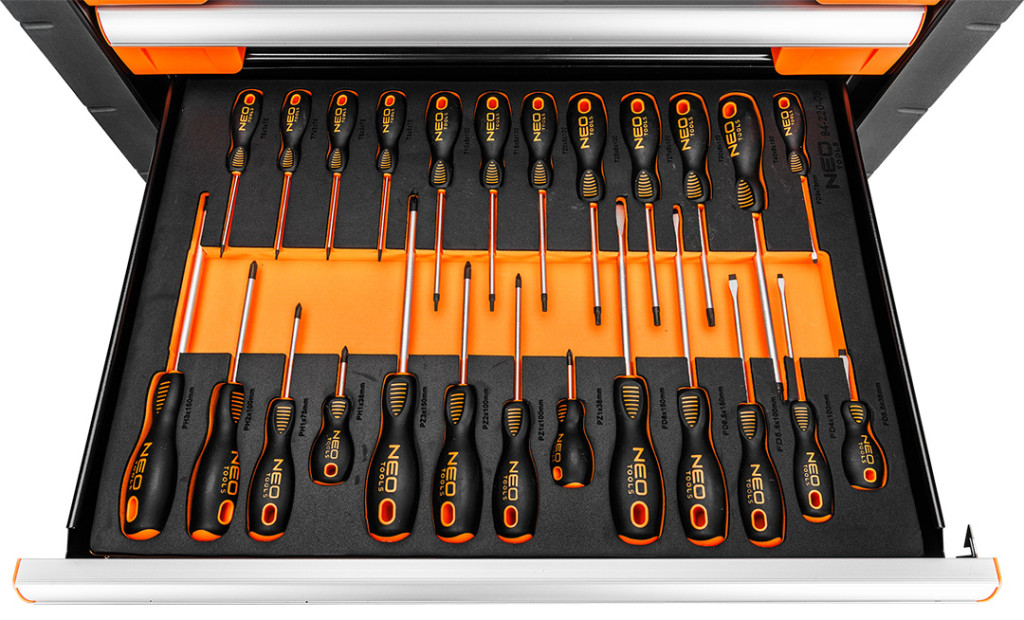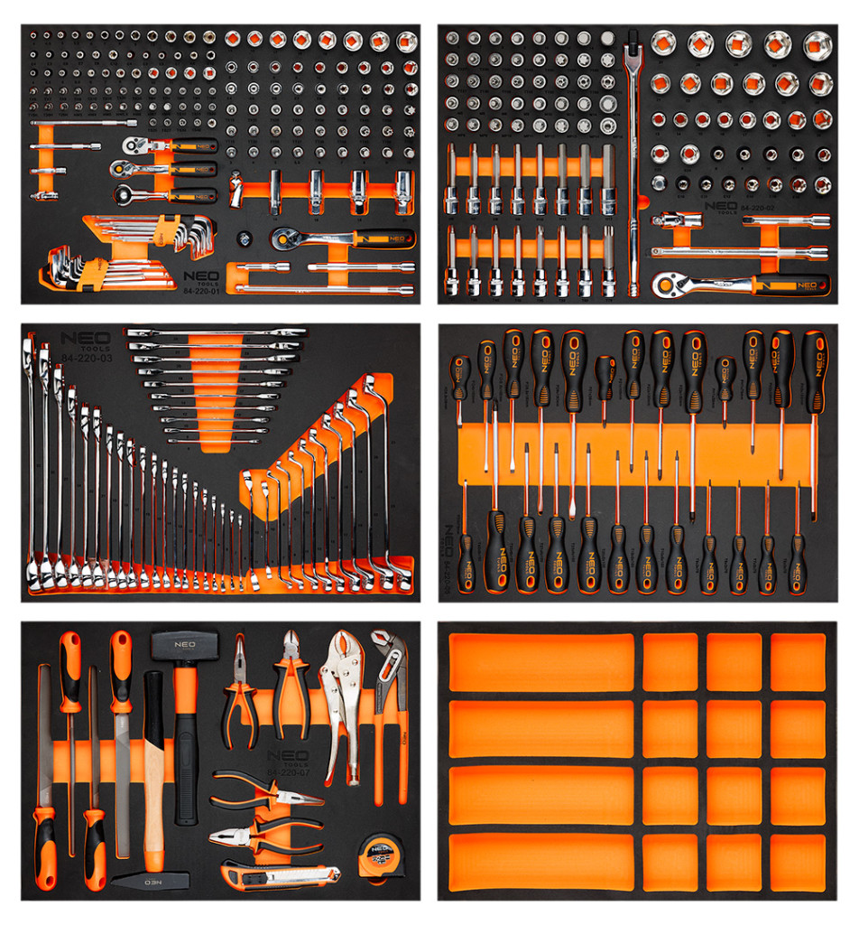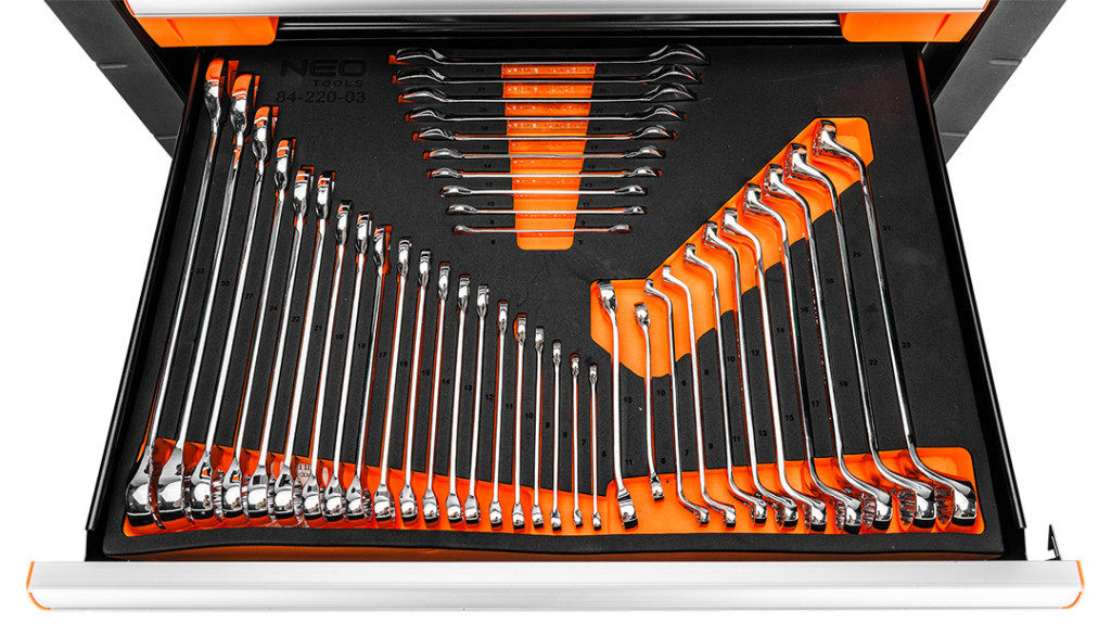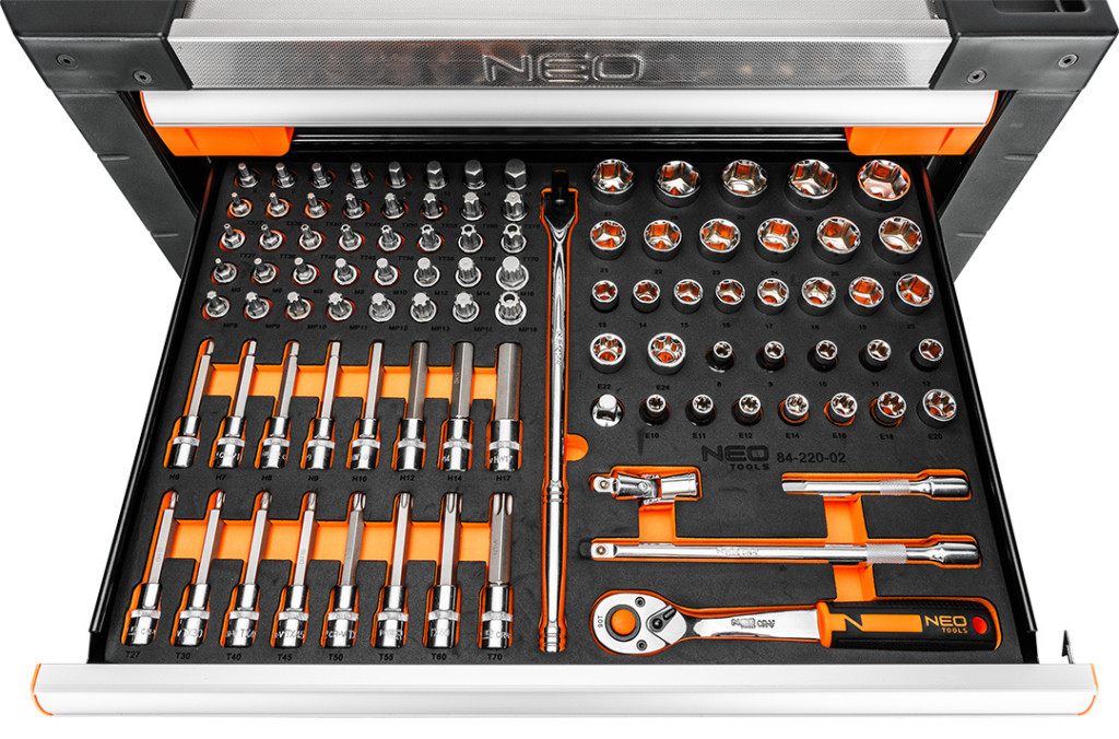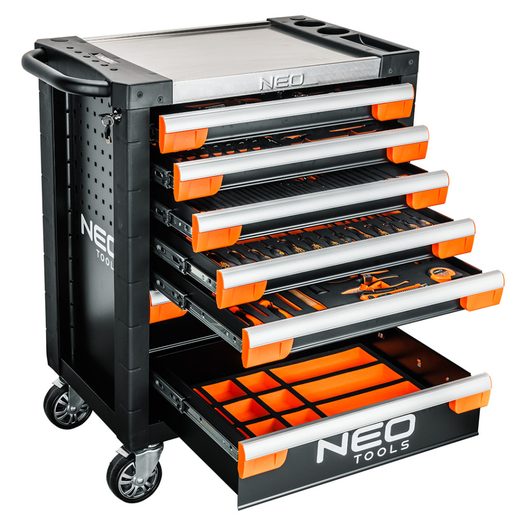 Neo 84-220-6 PRO Műhelykocsi 7 fiókkal, 329db szerszámmal 805x972x460mm, szerszámkocsi. A Neo Tools professzionális szerszámkocsija, amelynek maximális terhelhetősége 300 kg. Kínálatában 329 Neo Tools márkájú szerszámmal, 7 darab, számukra kialakított EVA habszivaccsal bélelt fiókkal. 6 fiókokban szerszámokkal ellátott betét található és egy üres fiók plusz eszközöknek. A fiókok készletei többek között a következőkből állnak: ¼", 3/8", TORX dugókulcsok, ötsarkos, Imbusz és TORX bitek, csuklók, adapterek, hosszabbítók, racsnisok, kulcsok, gyertyakulcsok, dugókulcsok, csavarhúzók, reszelők, kalapácsok vagy fogók.