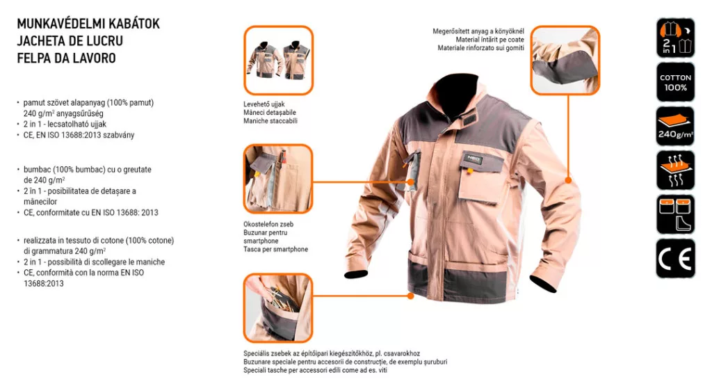 Neo munkavédelmi kabát 2 az 1-ben, XXL/58 100% pamut, 180g/m2, lezippzározható ujjak, XXL