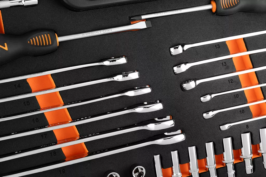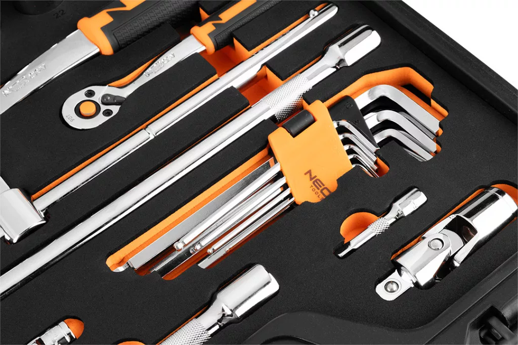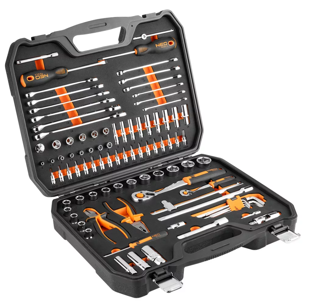 Neo 10-065 Szerszám és dugókulcs készlet, 1/4", 1/2", EVA habszivacs, műanyag koffer, 96db. Egy 95 szerszámból álló készlet, amely egy EVA-habos tokban van elhelyezve. A készlet ½" rövid hatlapú dugókulcsokat tartalmaz (15 db): 8, 10 (2 db), 11, 12, 13 (2 db), 14, 15, 17, 18, 19, 22, 24, 27 mm; 90T ½" racsni (1 db); ½" hosszabbítók (2 db): 125, 250 mm; ½" T-hajtókar 250 mm (1 db); kardáncsukló ½" (1 db); gyertyakulcs 3/8" (1 db): 14 mm; gyertyakulcs ½" gyertyákhoz (2 db): 16 mm, 21 mm; ½"F x 3/8 "M adapter (1 db). A Neo Tools készlet tartalma továbbá: rövid ¼" hatlapú dugókulcsok (13 db): 4, 4,5, 5, 5,5, 6, 7, 8, 9, 10, 11, 12, 13, 14 mm; hosszú ¼"-os hatlapú dugókulcsok (9 db): 4, 4,5, 5, 5, 5,5, 6, 7, 8, 9, 10, 11, 12, 13, 14 mm; hosszú ¼"-os hatlapú dugókulcsok (9 db): 90T ¼" racsnis szár (1 db); ¼" hosszabbítók (2 db): 6, 7, 8, 9, 10, 11, 12, 13, 14 mm: (1 db); ¼" T-hajtókar 115 mm (1 db); ¼" kardáncsukló (1 db); ¼" dugókulcsgomb (1 db); ¼" dugókulcsok (18 db): PZ1, PZ2, PZ3, PH1, PH2, PH3, TX10, TX15, TX20, TX25, TX30, TX40, H3, H4, H5, H6, H7, H8. A készlet a következőket is tartalmazza: villáskulcsok (12 db:) 8, 10 (2 db), 12, 13 (2 db), 14, 15, 16, 17, 18, 19 mm; kombináltfogó 160 mm (1 db); oldalcsípő 160 mm (1 db); csavarhúzók (2 db): SL6,5x100 mm, PH2x100 mm; Imbuszkulcsok (9 db): 1,5, 2, 2,5, 3, 4, 5, 6, 8, 10. Ez egy többcélú szerszámkészlet minden profi és barkácsoló számára.