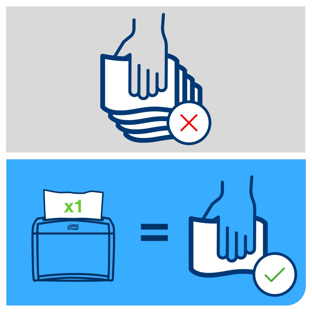 A kompakt kialakítású, modern adagolóból egyszerre egy szalvétát lehet kiemelni, így javul a higiénia, és minimum 25%-kal csökken a szalvétafogyasztás a hagyományos adagolórendszerekhez képest.