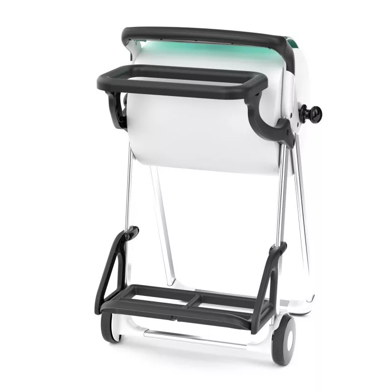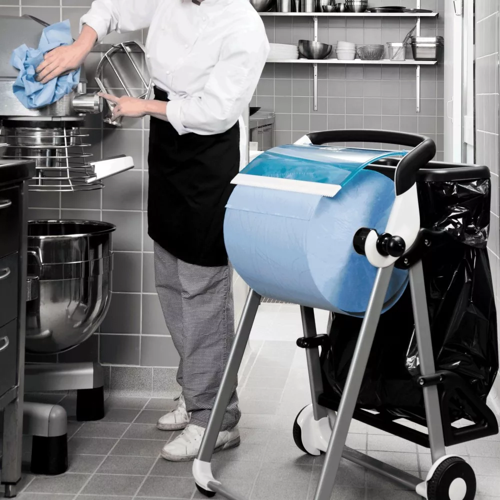 A Tork hordozható állványhoz készült Tork hulladékgyűjtőzsák-tartó segítségével menet közben is egyszerű a törlésre és tisztításra elhasznált törlők és kendők tárolása.