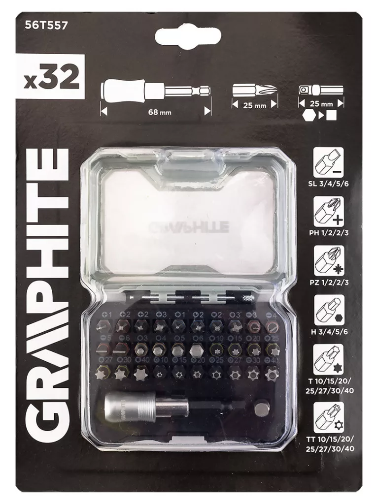 Graphite csavarhúzó bitkészlet 25mm, mágneses szárral műanyag tokban (32db/készlet)