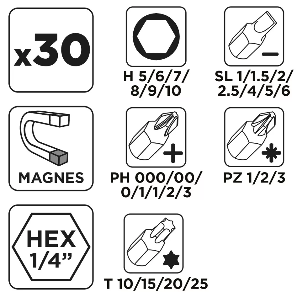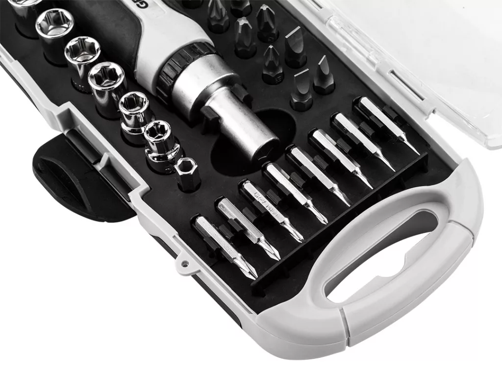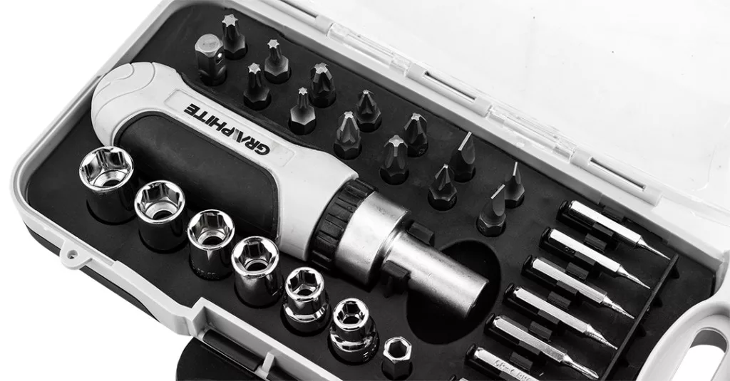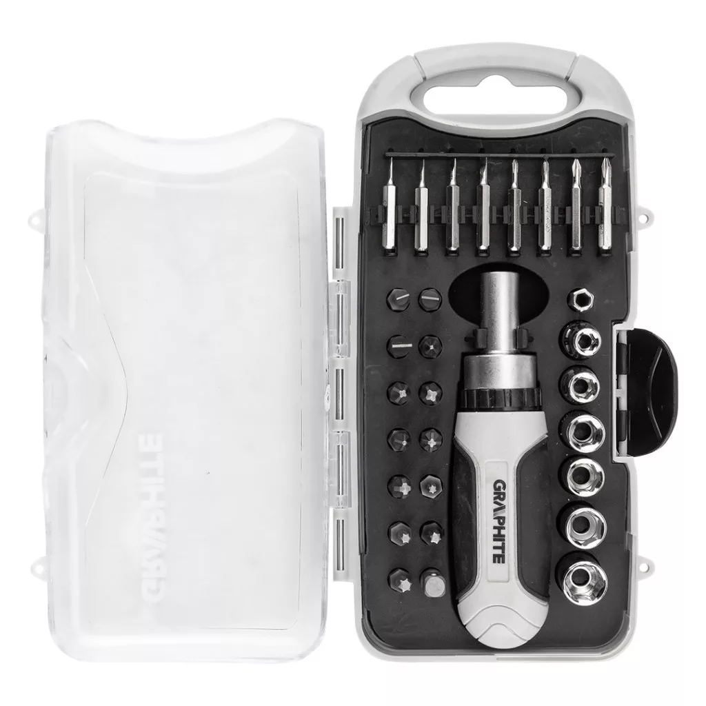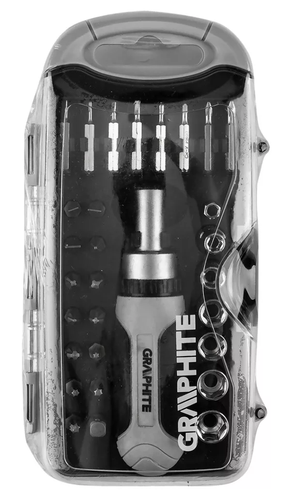 Graphite bitfejes csavarhúzó készlet 115mm-es racsnis szárral, műanyag tokban (30db/készlet)
