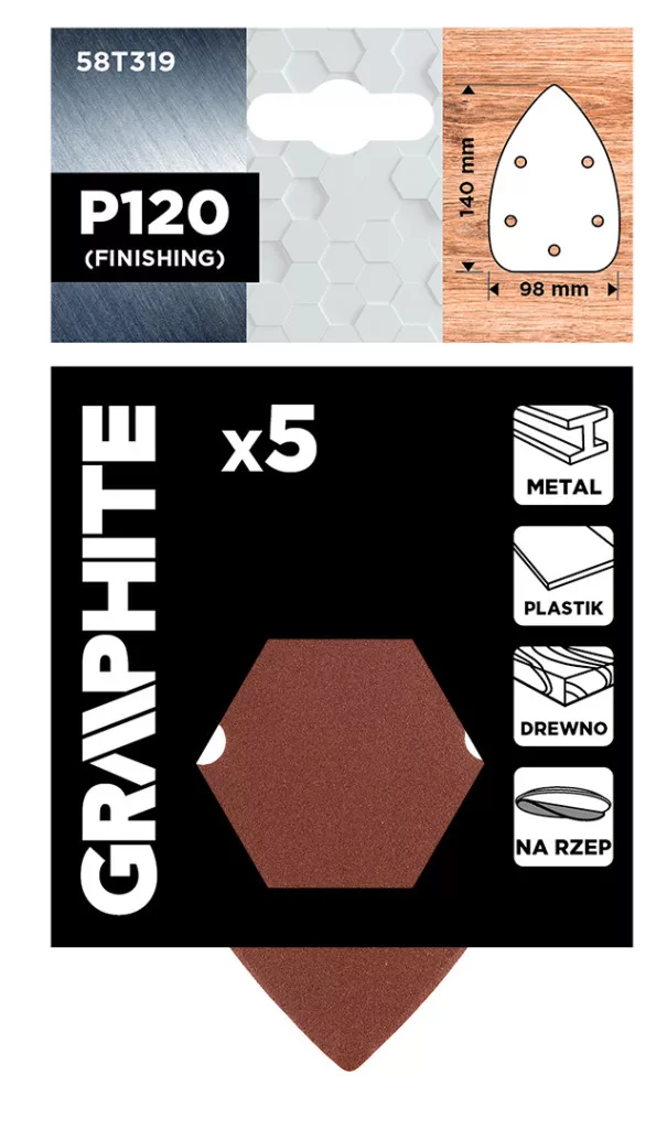 Graphite csiszolópapír tépőzáras deltacsiszolóhoz 98x140mm, P120, 5 lyukas (5db/csomag)