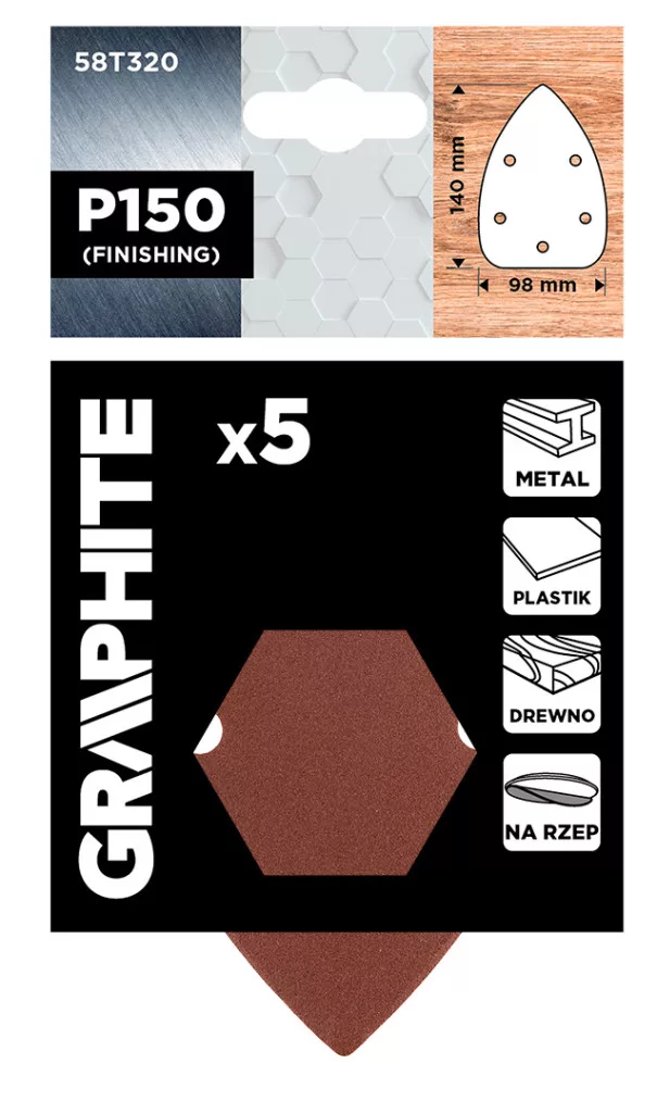 Graphite csiszolópapír tépőzáras deltacsiszolóhoz 98x140mm, P150, 5 lyukas (5db/csomag)